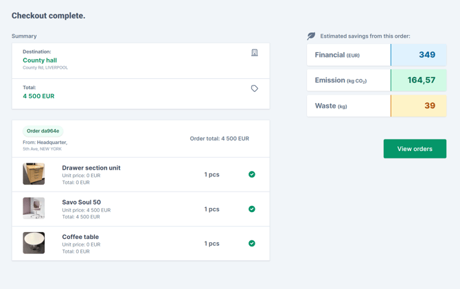 Her kan du også gjøre justeringer før du legger inn bestillingen, for eksempel legge til eller fjerne antall varer. Estimerte besparelser vises for handlekurven og kan vurderes før du fullfører bestillingen.