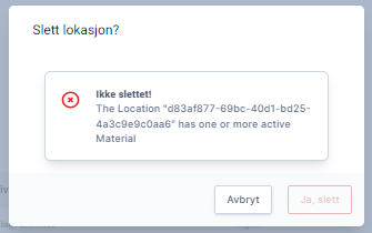 Om du forsøker å slette en lokasjon som fortsatt inneholder objekter / annonser, får du en feilmelding med beskjed om at lokasjonen ikke kan slettes. For å løse dette må du slette alle objekter og annonser som hører til lokasjonen du ønsker å slette.
